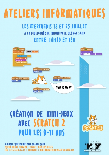 Avec le programme Scratch 2, les enfants s'initieront de façon ludique à créer un personnage et à le faire rebondir, chanter ou jouer d'un instrument... Cet atelier d'initiation aux algorithmes et de conception de mini-jeux vidéo est destiné aux débutants, le tout dans un esprit d'entraide et de convivialité.
